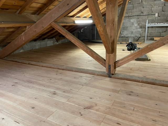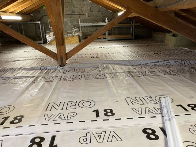 Avec la Mise en place d'un pare vapeur sur plancher bois pour souffler de la Ouate de cellulose en R8 =40 cm soufflé.